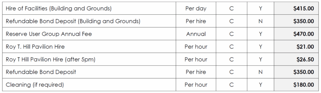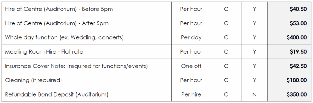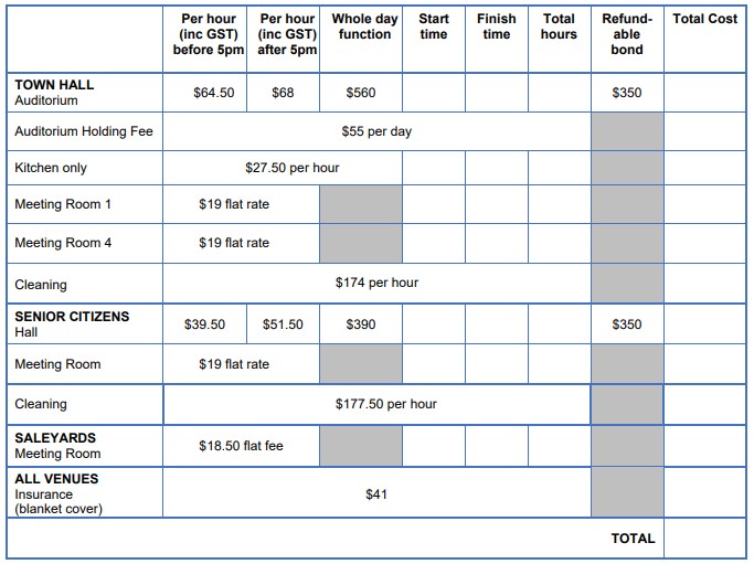 Charges for room hire are calculated according to the Benalla Rural City Council Fees and Charges Schedule which are current for each financial year. All fees and charges are GST inclusive.