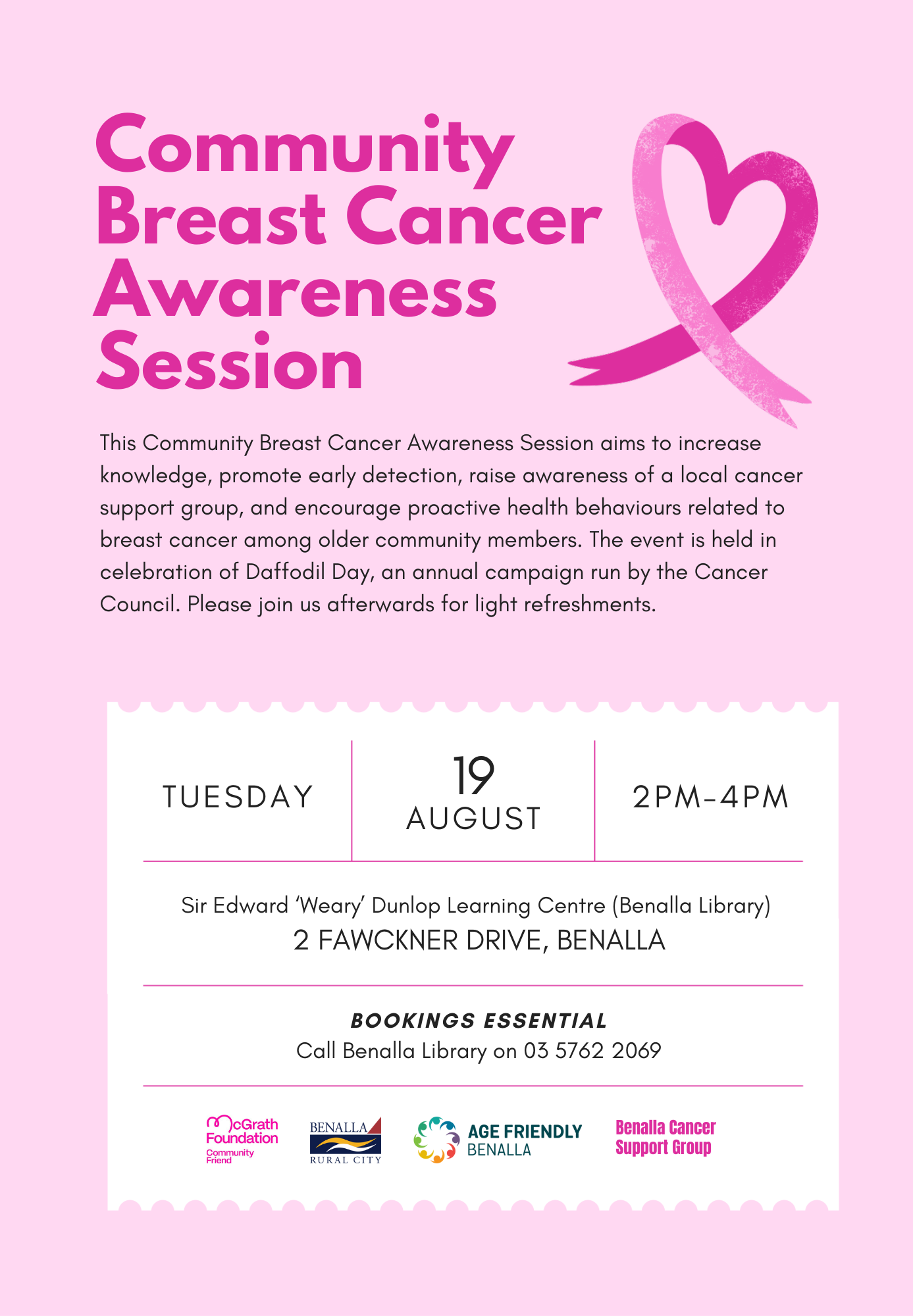 This Community Breast Cancer Awareness Session aims to increase knowledge, promote early detection, raise awareness of a local cancer support group, and encourage proactive health behaviours related to breast cancer among older community members. The event is held in celebration of Daffodil Day, an annual campaign run by the Cancer Council. Please join us afterwards for light refreshments.