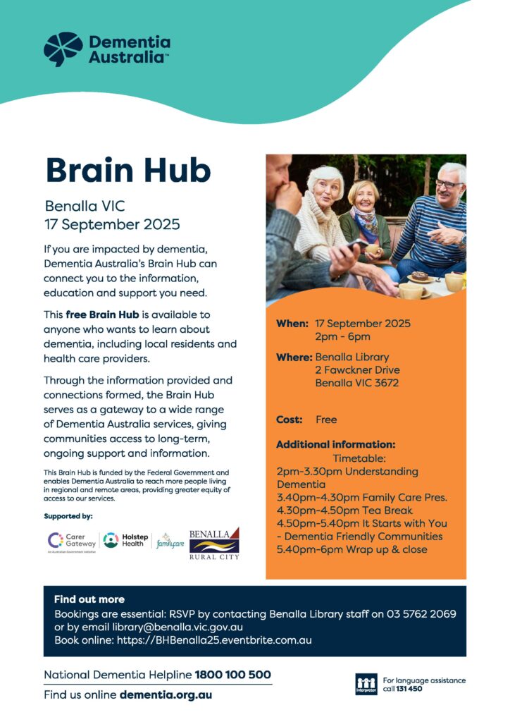 Through the information provided and connections formed, the Brain Hub serves as a gateway to a wide range of Dementia Australia services, giving communities access to long-term, ongoing support and information.