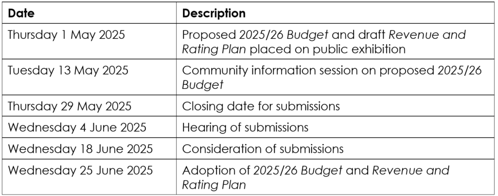 Any person proposing to make a submission regarding the proposed 2025/26 Budget and draft Revenue and Rating Plan must do so in writing by 5pm Thursday 29 May 2025.